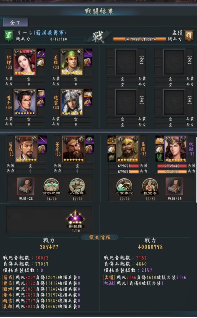 前衛:孟獲(盾)(玲瓏獅蛮帯Lv3、白鵠、N兵装)、南蛮先鋒(馬)(青紅の剣Lv3、白鵠、N兵装)